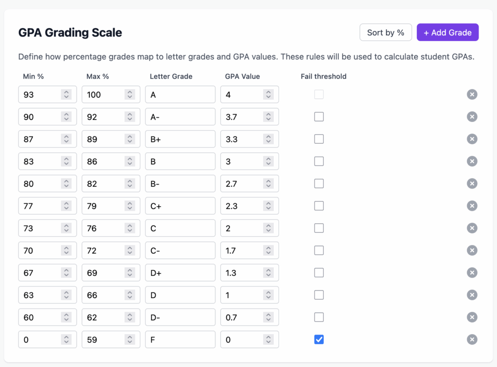Scholaright has provided reasonable GPA rules, associating letter grades with percentages. You can either leave these as-is, or customize them to fit your own needs.