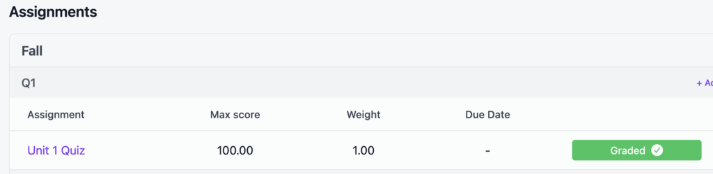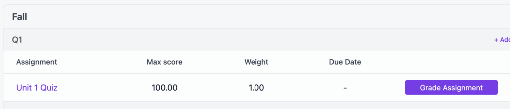 Once you’ve opened your course, you will see it divided by the terms and quarters you chose. Within each section, you can click + Add Assignment to create an assignment in that term/quarter.
