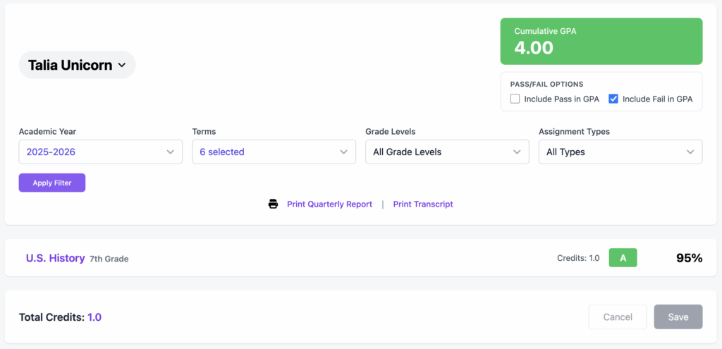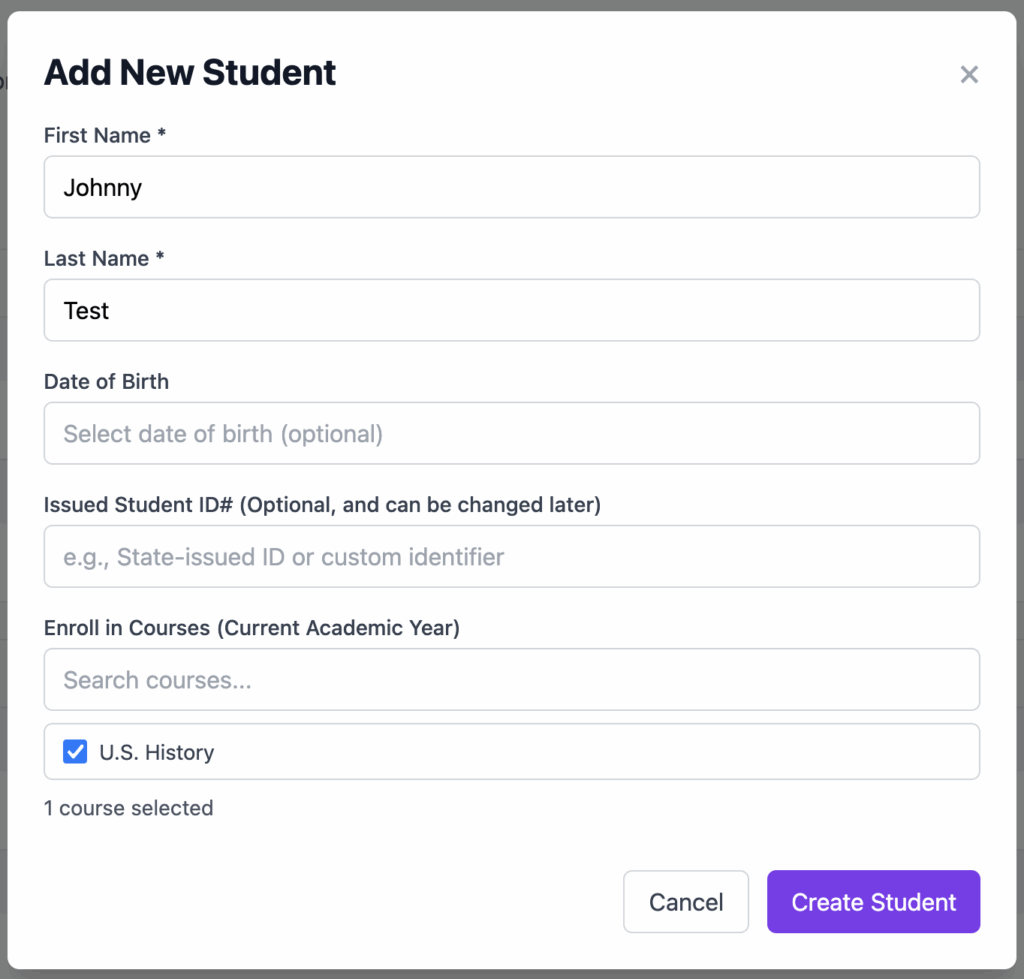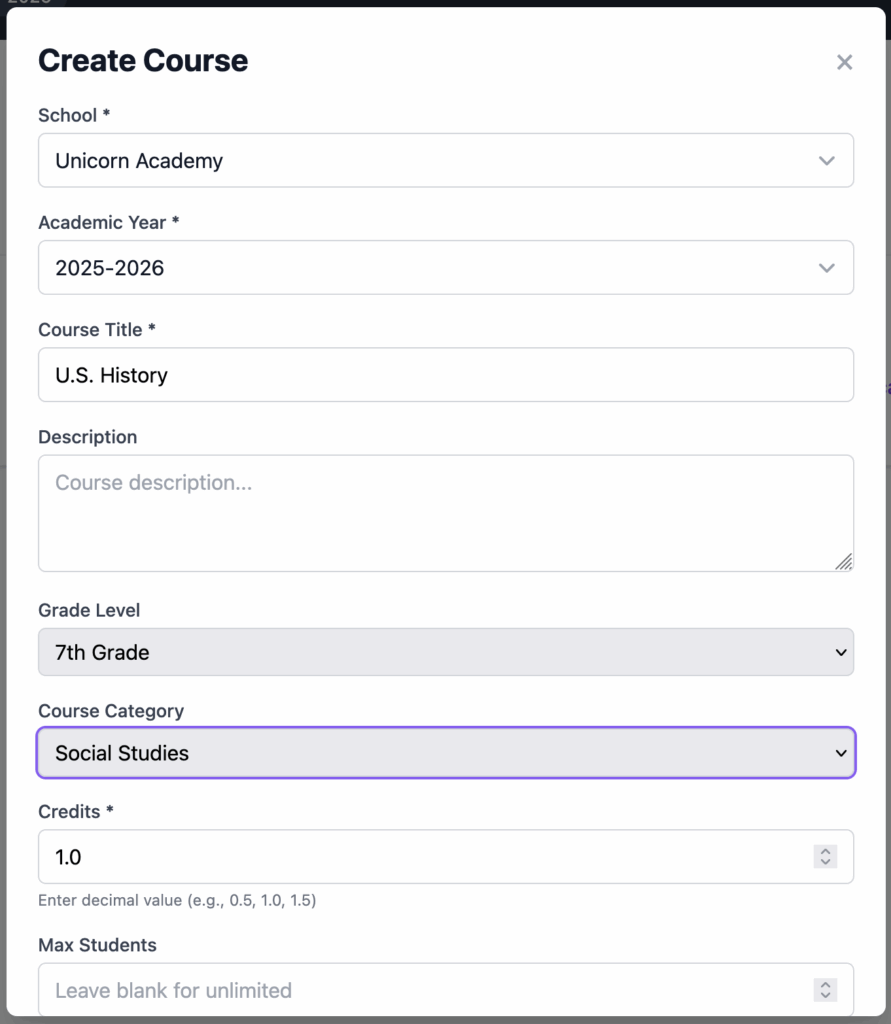 Enter a Course Title, like U.S. History. Description is optional, but some states require reports to include a description of what is covered in a course. Whatever you enter here will be included in reports.