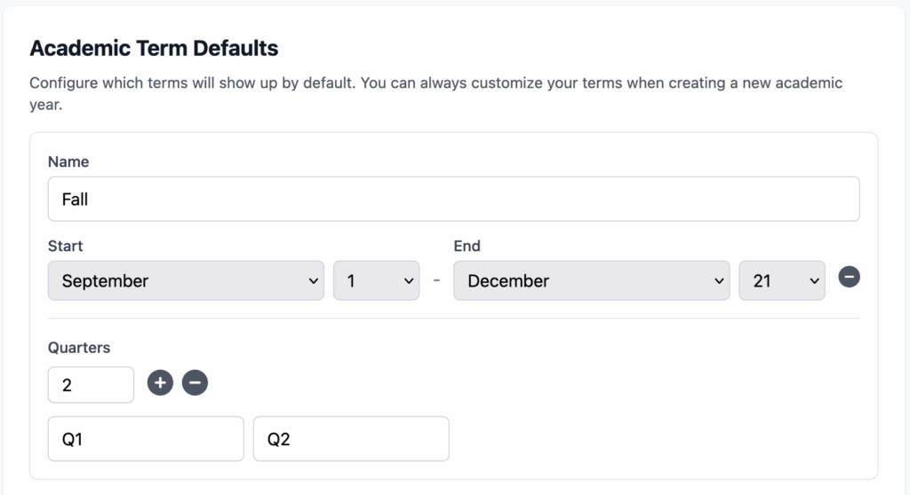 The default terms are designed around a typical US school that has a Fall and Spring semester/term, and two quarters within each semester. Adjust to whatever fits your school’s needs. For example, you may have three terms called Term 1, Term 2, and Term 3, without any quarters.