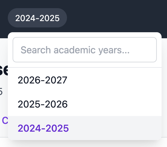 You should only need choose a Start and End Date for your academic year and the rest will be filled in by the Academic Term Defaults you chose while creating your school. Click Create Academic Year to finish. Double-check that your new academic year is selected in the top bar: