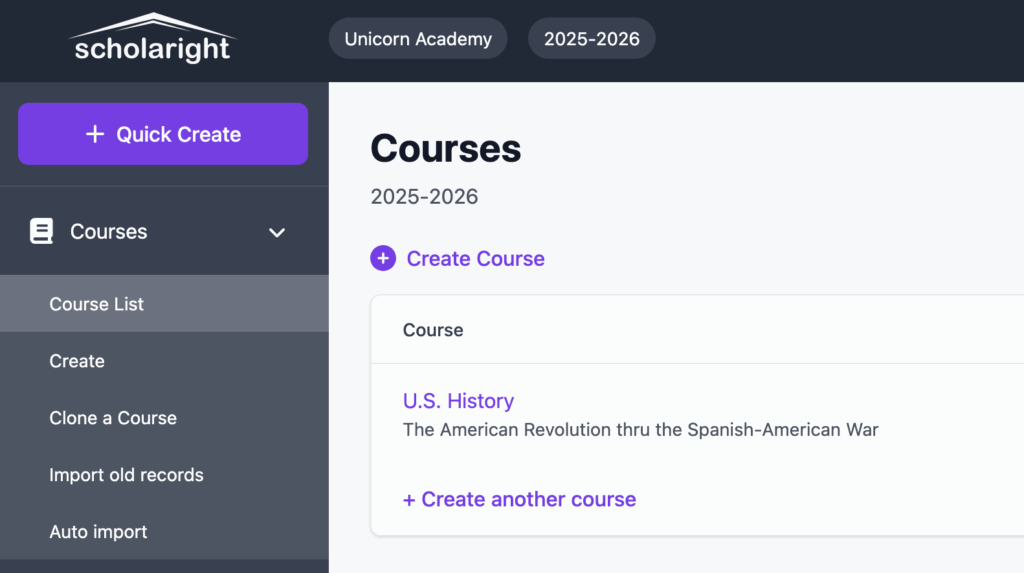 You will use courses to create assignments and manage students’ grades, so courses are the heart of Scholaright. Click the Quick Create button and choose Course.